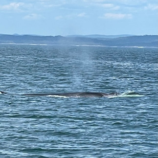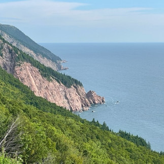 Those of you who are fortunate enough to take a trip through the Maritime Provinces of New Brunswick, Prince Edward Island, and Nova Scotia, Canada know that beautiful sights, friendly people, and great food and drink abound. Here are some pictures of the amazing geology of the conglomerate rocks at Hopewell Rocks on the Bay of Fundy, where a 40 foot tidal range leaves boats moored at harbor, high and dry; the red cliffs at Cavendish; the views of the Cabot Trail; hiking paths at Ingonish; a Ceilidh (pronounced Kay-lee) in Baddeck; a historical marker highlighting Champlain's meeting with Portuguese fishermen near Canso; another marker in Halifax for the "Grand Derangement" (or Great Upheaval) where the British forced 10,000 men, women, and children to leave Acadia after the French and Indian War, and which is the source of our rich, Cajun, culture; and the soft sand and blue water of Carter's Beach. I've thrown in a picture of a fin backed whale we saw on a whale watching expedition out of St. Andrews. This whale was 65-80 feet long!